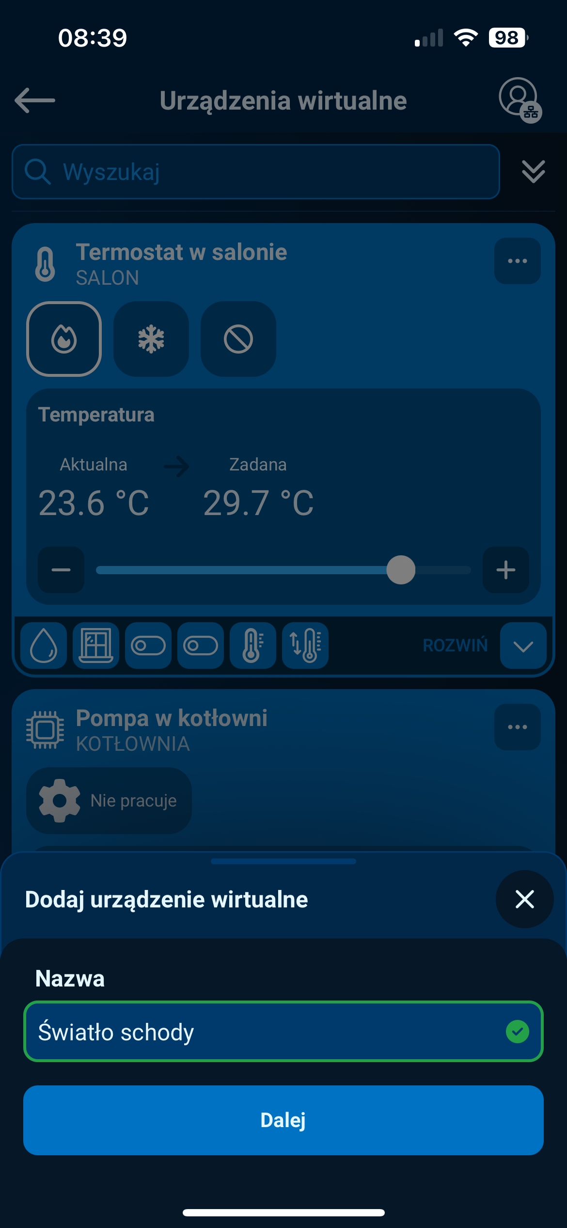 Wpisz nazwę urządzenia, np. Światło schody, i kliknij Dalej.