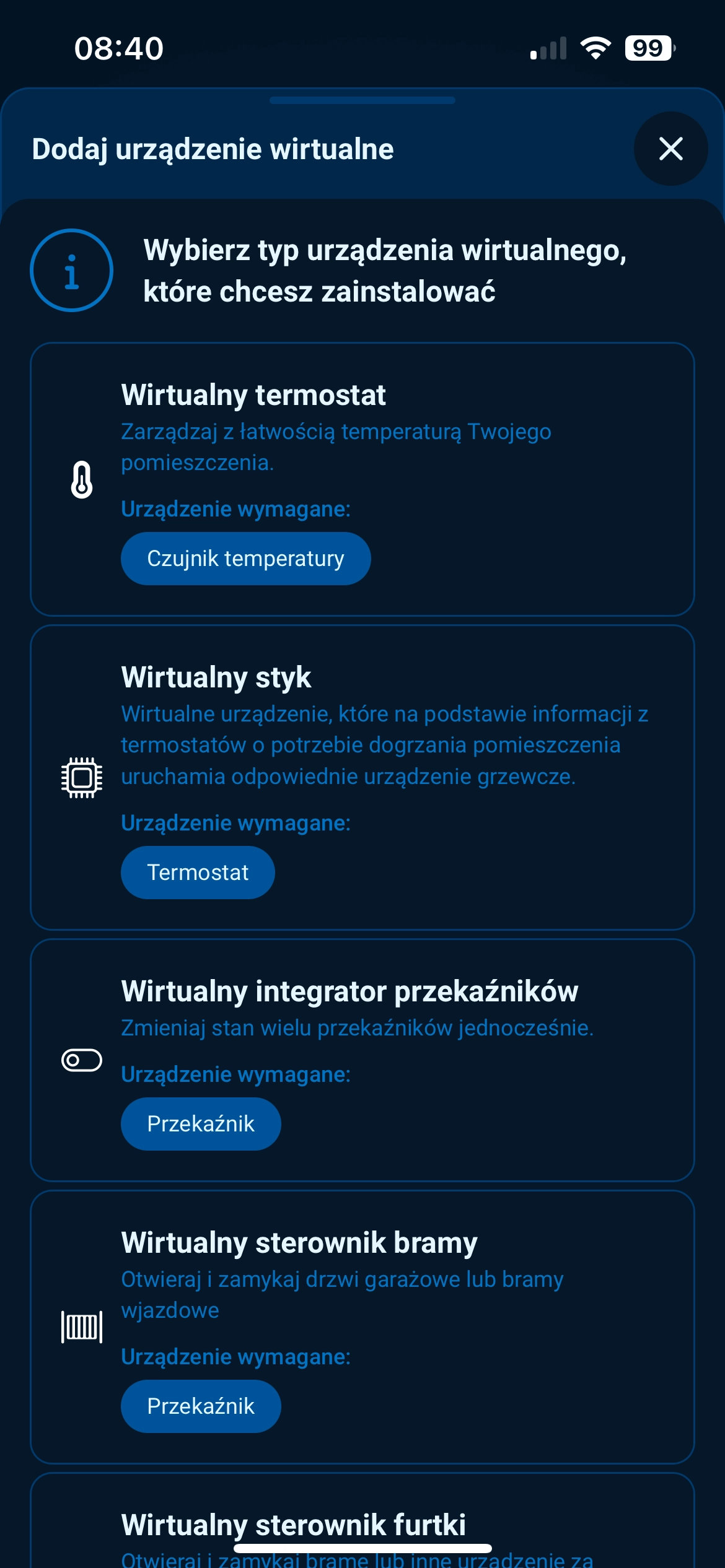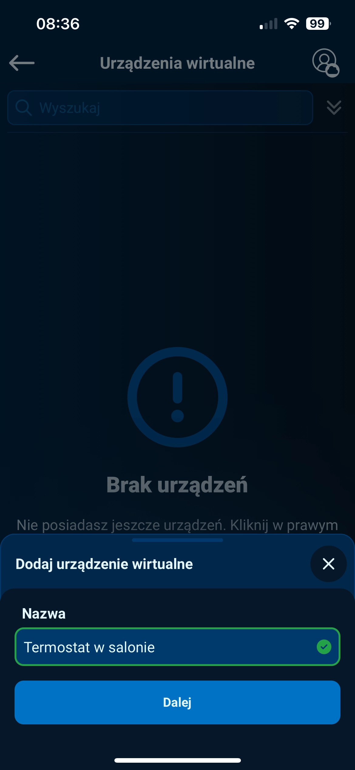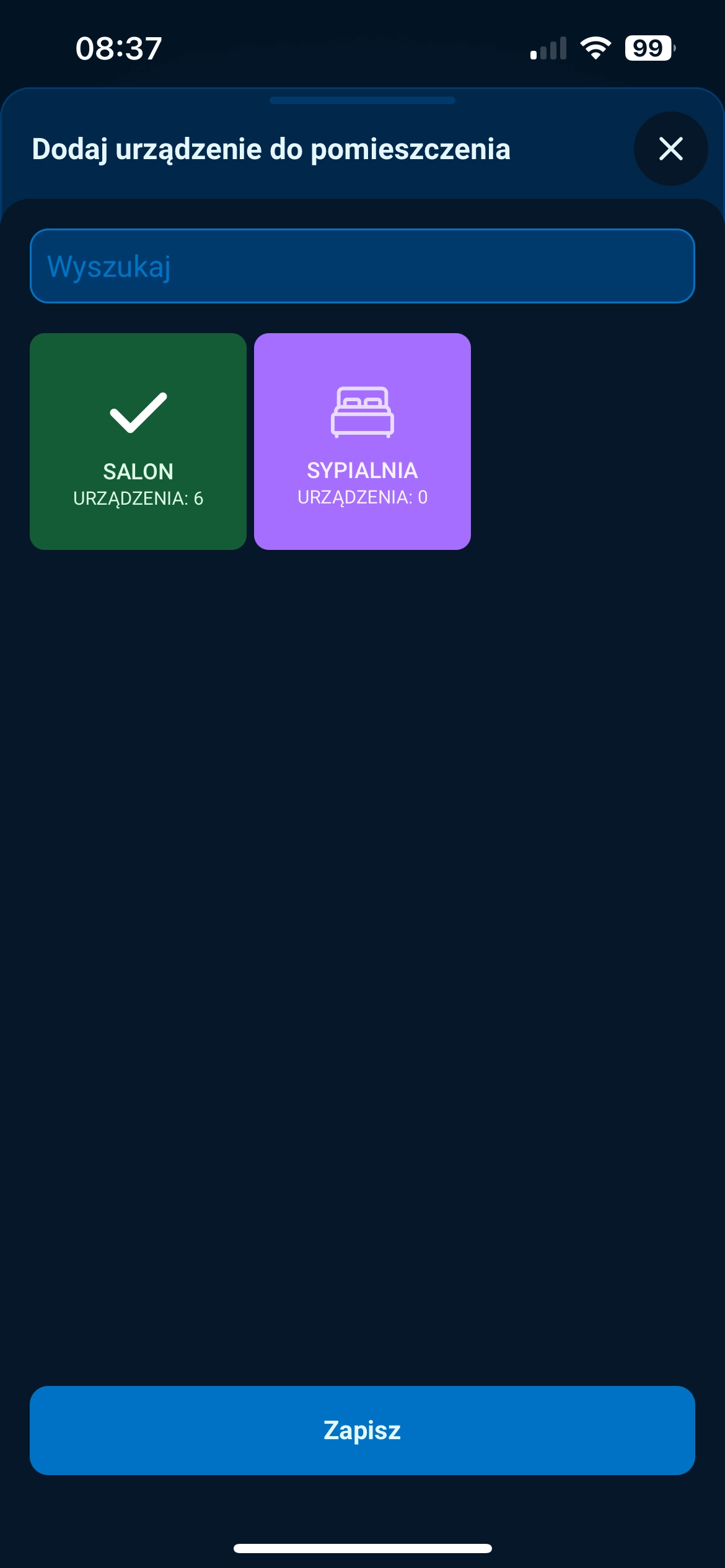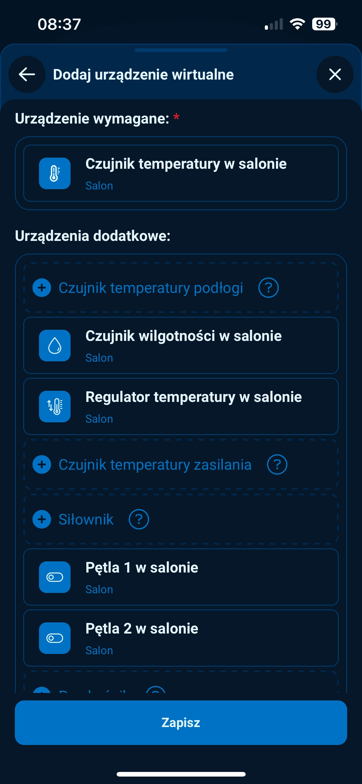 Jeśli posiadasz utworzone pomieszczenia, wybierz pomieszczenie i kliknij Zapisz ponownie, aby zakończyć konfigurację wirtualnego termostatu.
