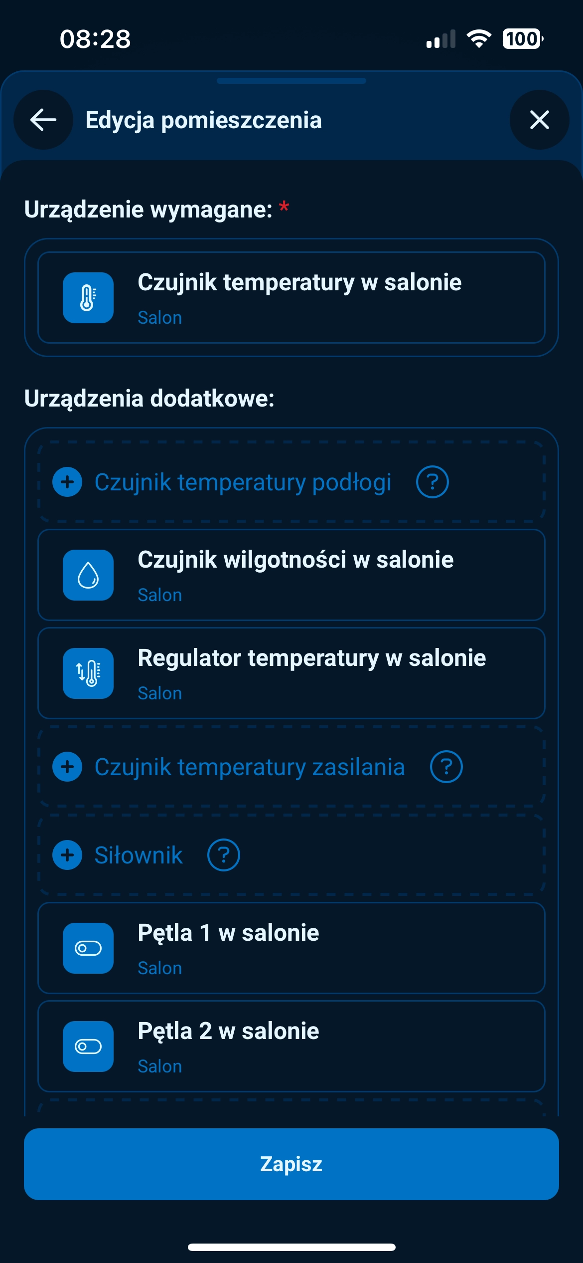 Uwaga: Przed konfiguracją ogrzewania upewnij się, że wszystkie niezbędne urządzenia zostały dodane do wybranego pomieszczenia. Wymagane są: