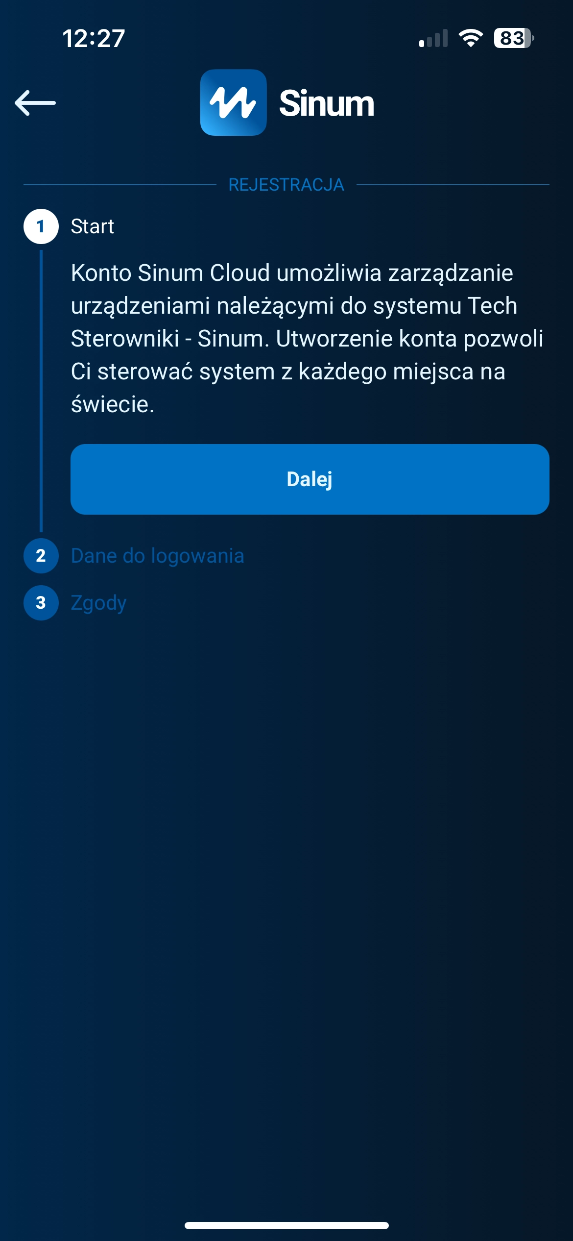 Na ekranie pojawi się informacja o korzyściach płynących z posiadania konta Sinum Cloud. Kliknij Dalej.