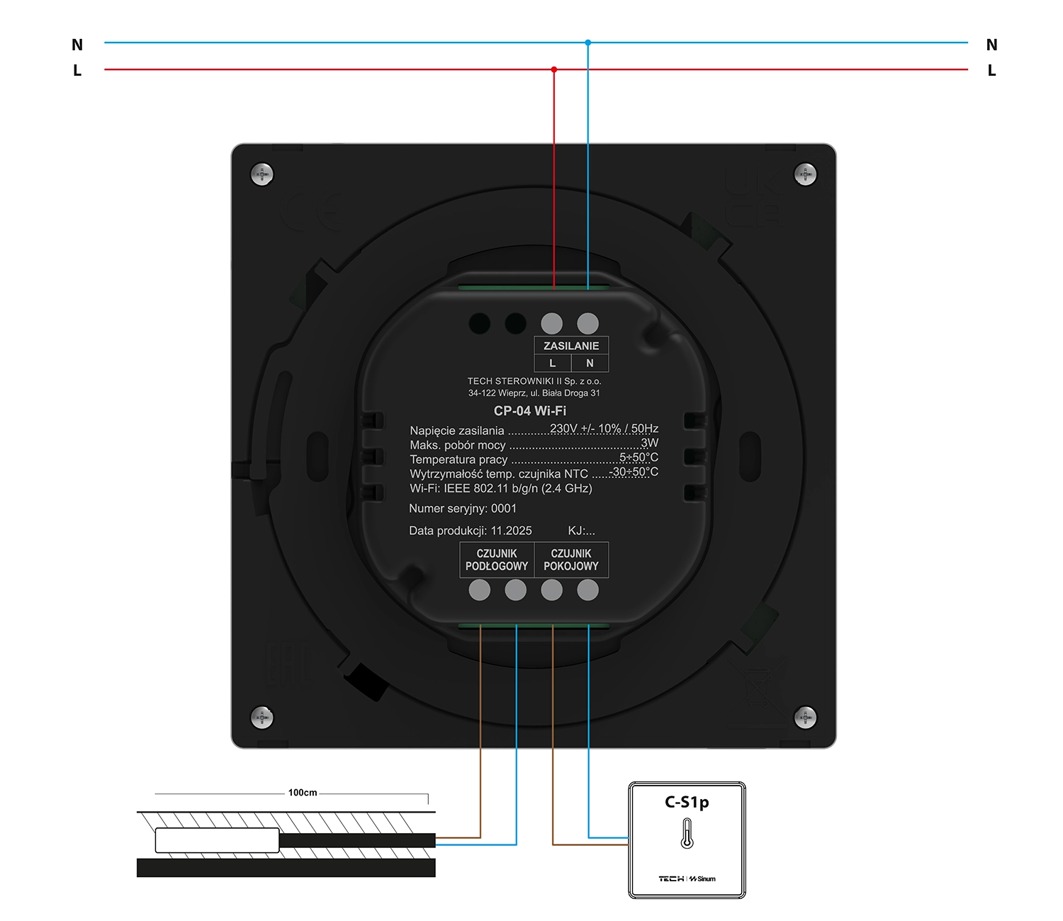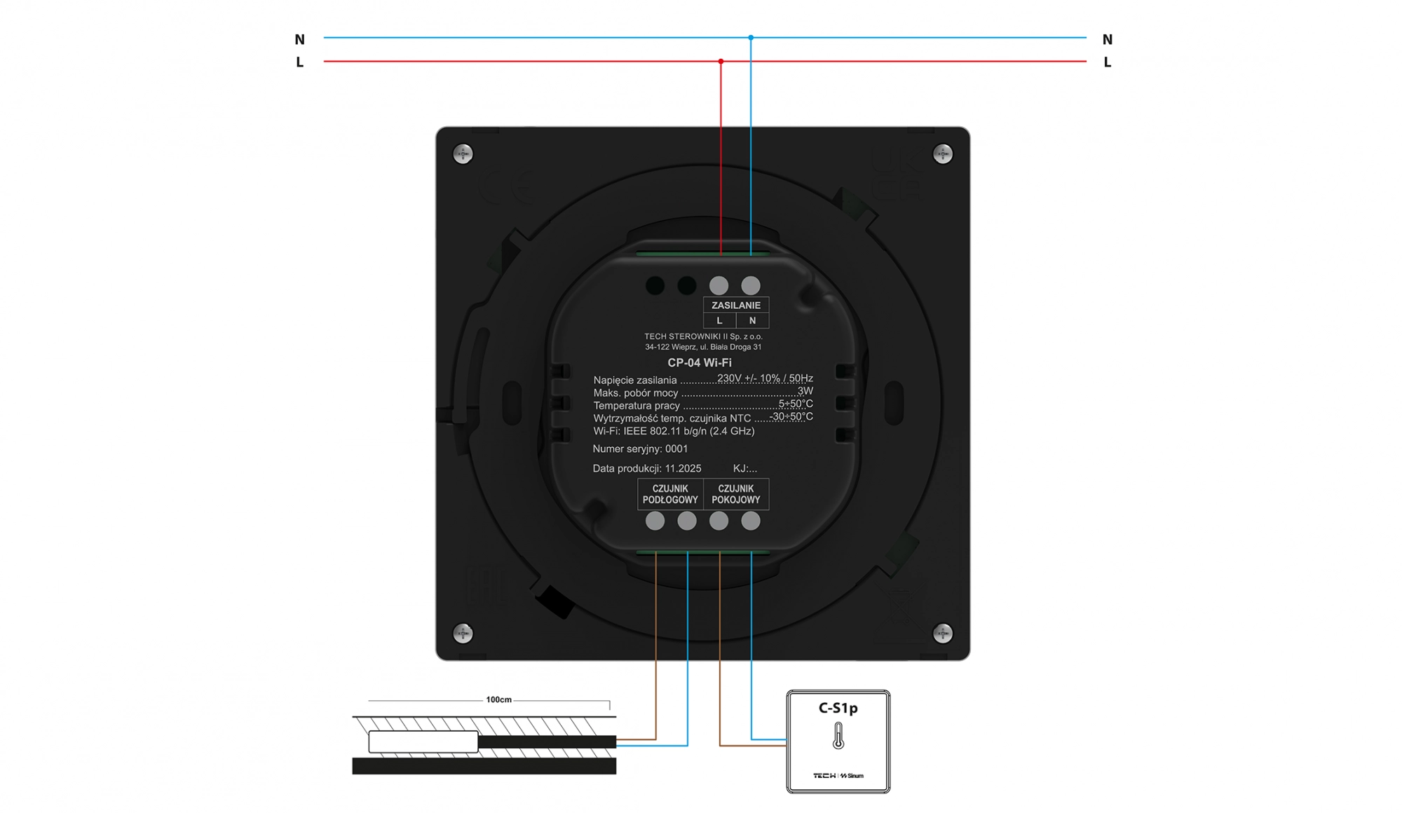 Panel kontrolny CP-04 Wi-Fi łączy się z centralą Sinum za pomocą Wi-Fi: IEEE 802.11b/g/n (2,4 GHz) i zasilany jest 230V AC. Urządzenie umożliwia podłączenie opcjonalnych czujników temperatury: pokojowego oraz podłogowego. Panel montowany jest podtynkowo do puszki Ø60 mm. Prawidłowe podłączenie przewodów komunikacyjnych i czujników zapewnia pełną funkcjonalność sterownika.
