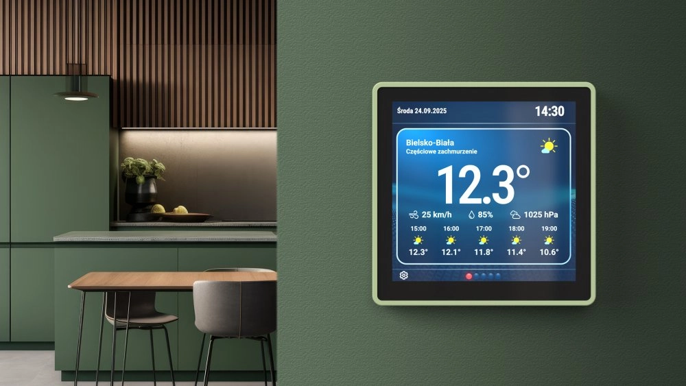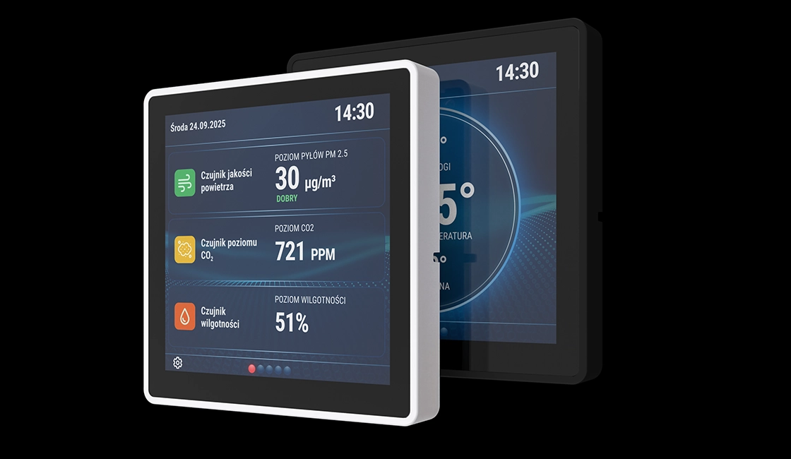 Front urządzenia to szklany, kolorowy ekran dotykowy, który nadaje mu nowoczesny i minimalistyczny wygląd. Gładka powierzchnia szkła płynnie łączy się z solidną obudową, dzięki czemu całość prezentuje się estetycznie i jest starannie wykonana.