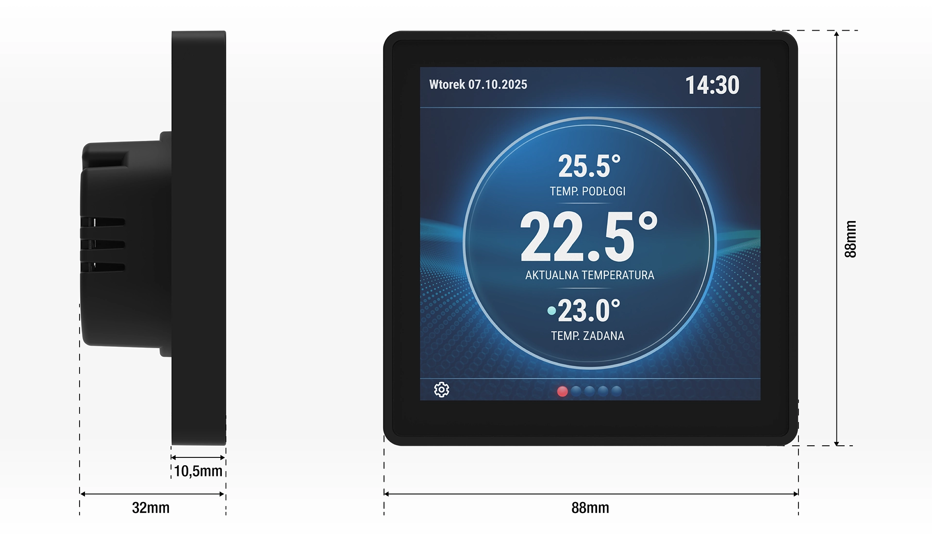 Panel kontrolny CP-04 Wi-Fi został zaprojektowany w sposób kompaktowy. Dzięki precyzyjnie dobranym wymiarom, urządzenie doskonale mieści się w standardowych puszkach montażowych, co zapewnia estetyczne wykończenie i idealne dopasowanie.