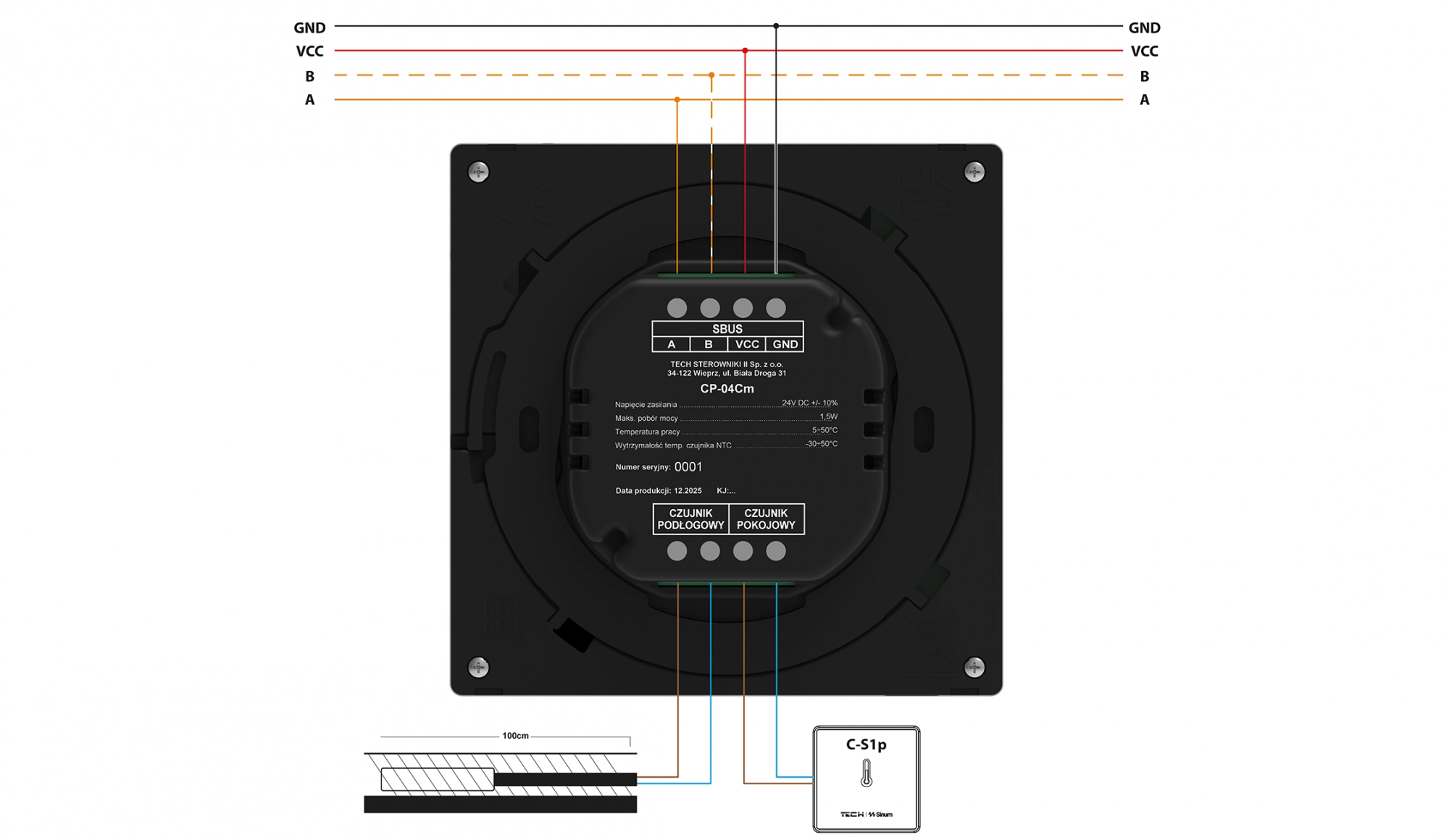 Panel kontrolny CP-04Cm łączy się z centralą systemu Sinum poprzez magistralę SBUS i zasilanie 24V DC. Urządzenie umożliwia podłączenie opcjonalnych czujników temperatury: pokojowego oraz podłogowego. Panel montuje się podtynkowo w puszce Ø60 mm. Prawidłowe podłączenie przewodów komunikacyjnych i czujników zapewnia pełną funkcjonalność sterownika.