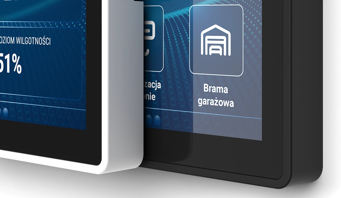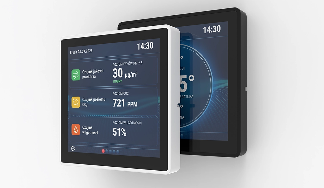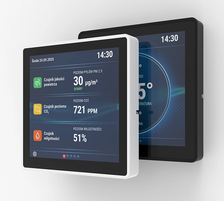 Front urządzenia to szklany, kolorowy ekran dotykowy, który nadaje mu nowoczesny i minimalistyczny wygląd. Gładka powierzchnia szkła płynnie łączy się z solidną obudową, dzięki czemu całość prezentuje się estetycznie i jest starannie wykonana.