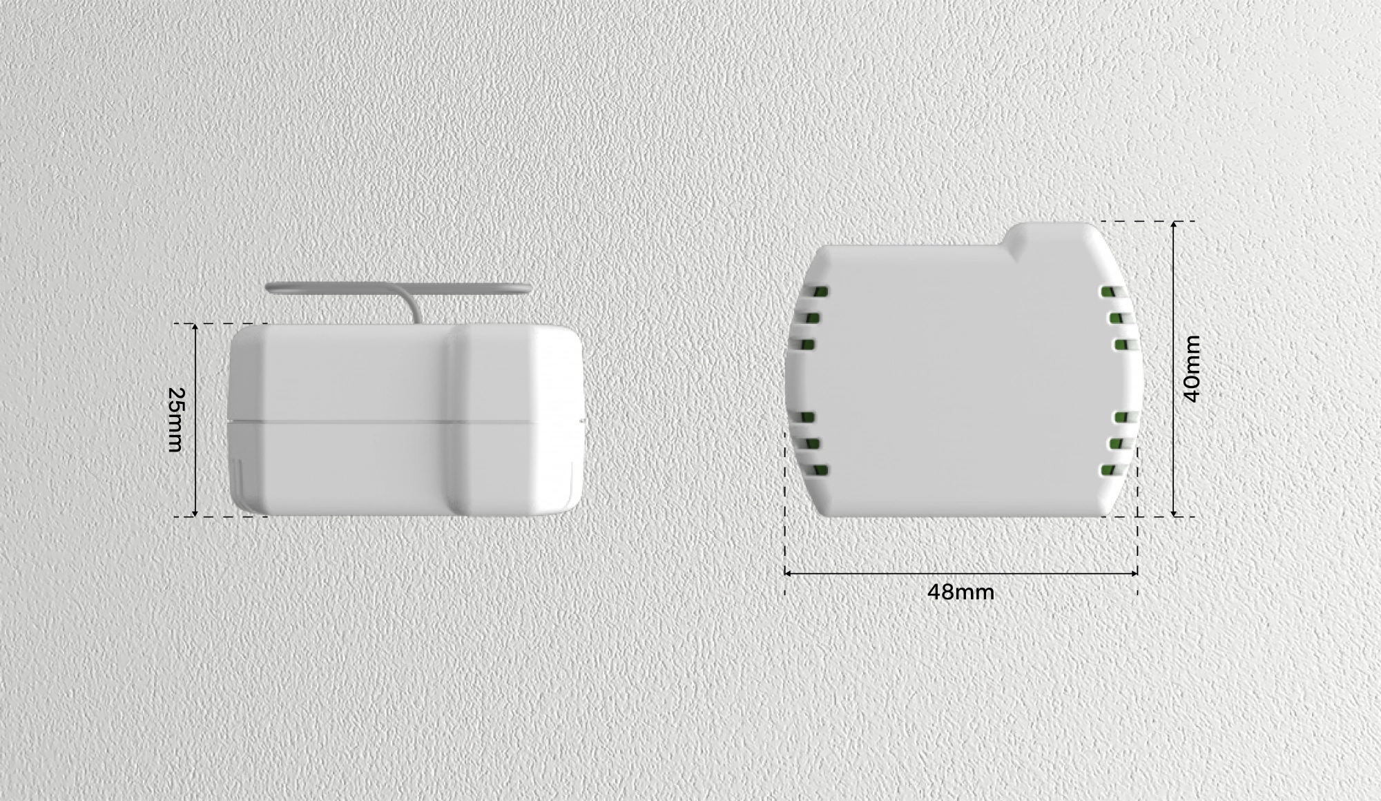 Moduł PPS-02 to niewielkie urządzenie o wymiarach 40x48x25 mm, co pozwala na jego wygodny montaż w standardowej puszce elektrycznej o średnicy 60 mm. Kompaktowe rozmiary sprawiają, że moduł jest dyskretny i nie wpływa na estetykę wnętrza, pozostając całkowicie niewidoczny po instalacji.