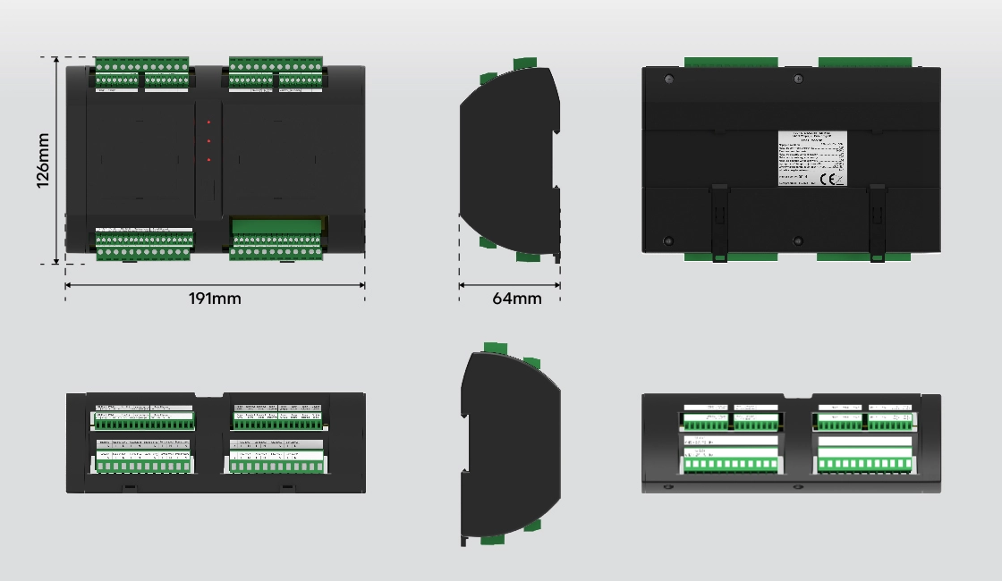 Moduł wykonawczy został zaprojektowany w sposób umożliwiający wygodne umieszczenie go w standardowych szafkach elektrycznych. Dzięki przemyślanej konstrukcji i proporcjom, urządzenie idealnie mieści się na szynie DIN, zapewniając nie tylko funkcjonalność, ale również estetyczne i uporządkowane rozmieszczenie elementów instalacji.