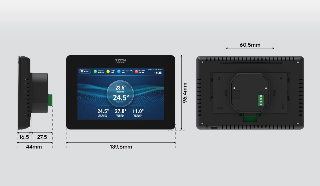 Wersja dopuszkowa panelu sterowania została zaprojektowana z myślą o łatwym i szybkim montażu. Wyposażona w nowoczesny, dotykowy wyświetlacz TFT o przekątnej 5'', umożliwia intuicyjne sterowanie całym systemem grzewczym.