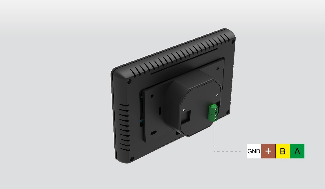 Panel komunikuje się z modułem wykonawczym za pośrednictwem przewodowego połączenia RS, zapewniając stabilną i szybką wymianę danych. Złącze jest umieszczone z tyłu urządzenia, umożliwiając łatwe poprowadzenie przewodu wewnątrz ściany. Instalacja nie wymaga dodatkowego zasilania – komunikacja i zasilanie odbywają się poprzez jedno wspólne połączenie.