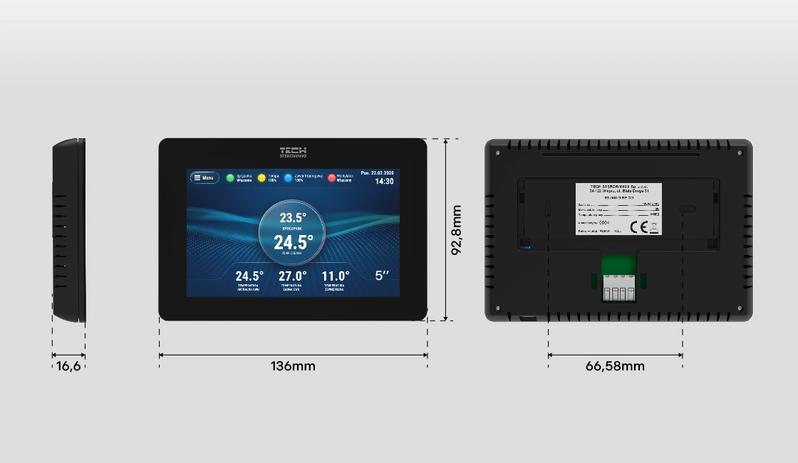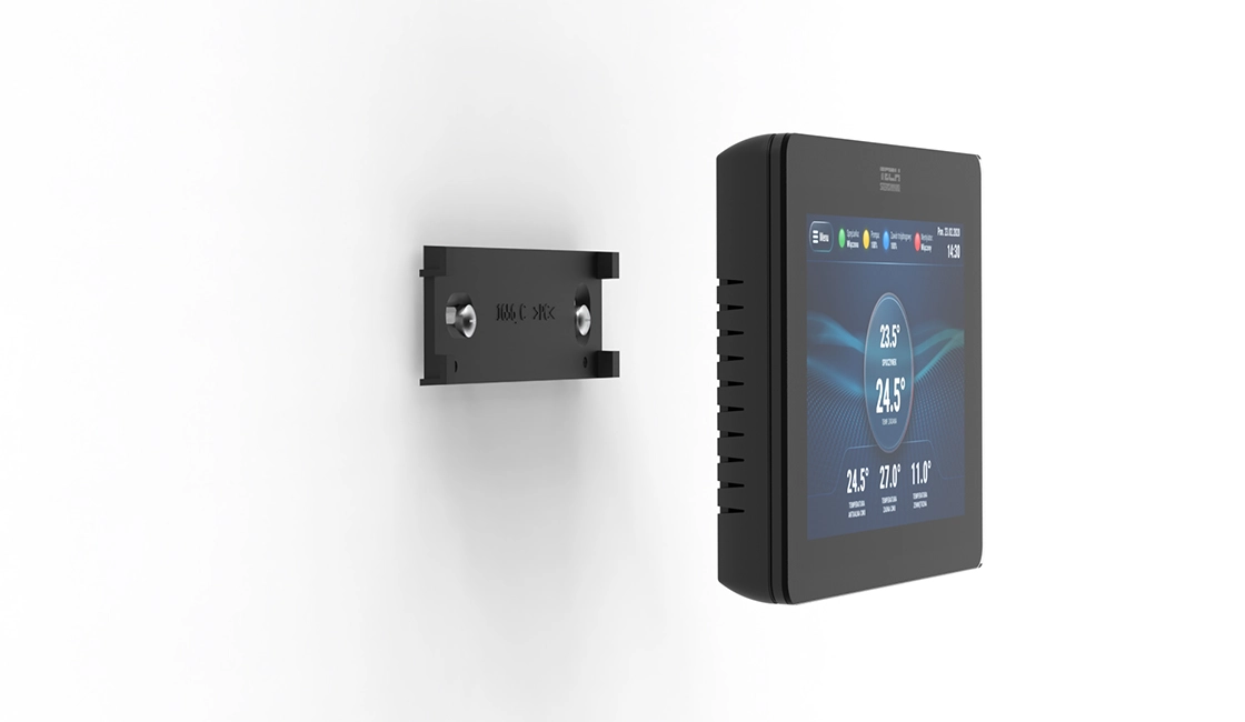 Wersja nadtynkowa panelu sterowania została zaprojektowana z myślą o łatwym i szybkim montażu bez potrzeby ingerencji w strukturę ściany. Wyposażona w nowoczesny, dotykowy wyświetlacz TFT o przekątnej 5'', umożliwia intuicyjne sterowanie całym systemem grzewczym.