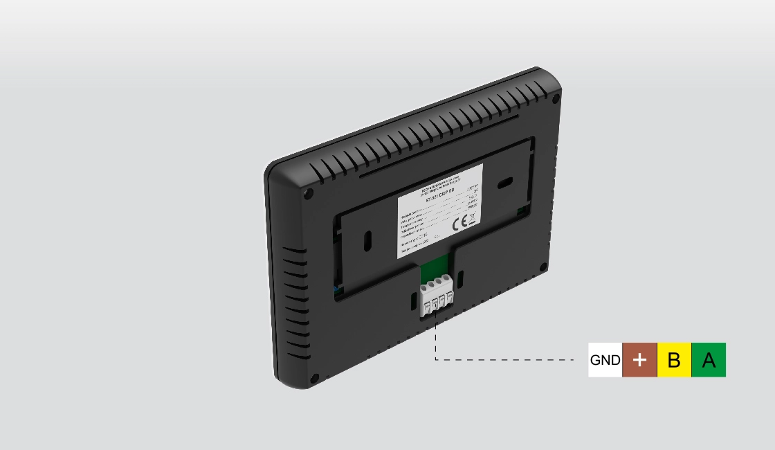 Panel komunikuje się z modułem wykonawczym za pośrednictwem przewodowego połączenia RS, zapewniając stabilną i szybką wymianę danych. Złącze jest umieszczone z tyłu urządzenia, umożliwiając łatwe poprowadzenie przewodu wewnątrz ściany. Instalacja nie wymaga dodatkowego zasilania – komunikacja i zasilanie odbywają się poprzez jedno wspólne połączenie.