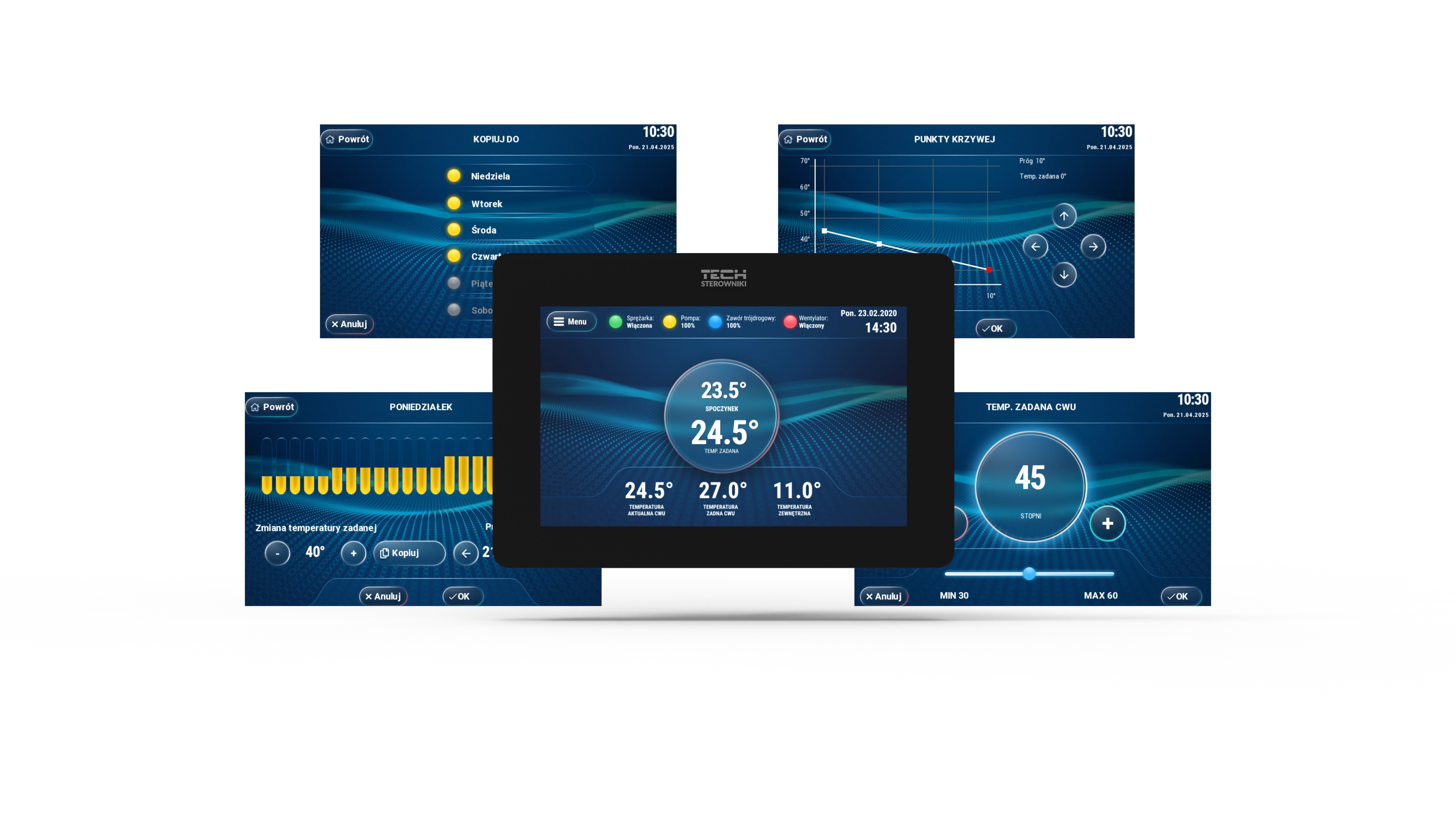 Jako intuicyjne centrum zarządzania systemem pompy ciepła, które łączy funkcjonalność z estetyką wykonania. Umożliwia wygodne sterowanie wszystkimi kluczowymi parametrami pompy, prezentując dane w przejrzysty i czytelny sposób. Wyświetlacz TFT, czuły ekran dotykowy oraz logiczne menu sprawiają, że codzienna obsługa staje się szybka, łatwa i przyjazna użytkownikowi.